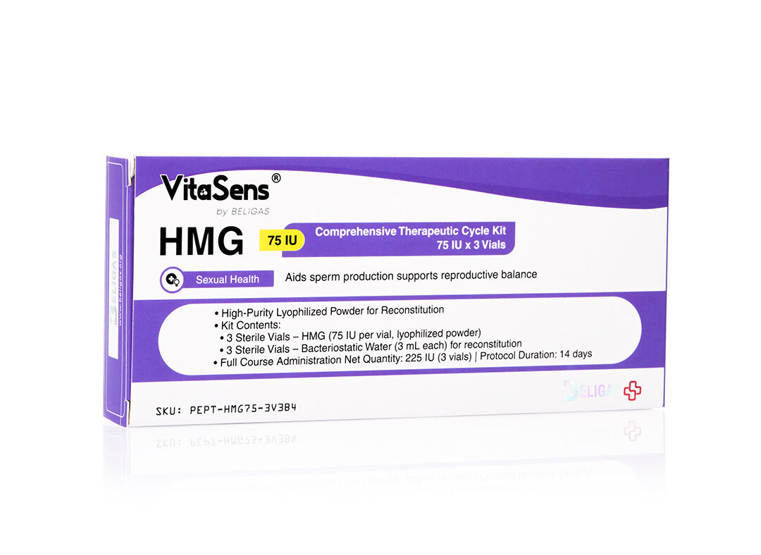 • Pack Size: 3 sterile vials – HMG 75 IU (lyophilized powder) + 3 sterile vials – Bacteriostatic Water 3 mL