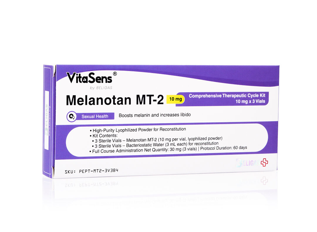 • Pack Size: 3 sterile vials – Melanotan MT-2 10 mg (lyophilized powder) + 3 sterile vials – Bacteriostatic Water 3 mL